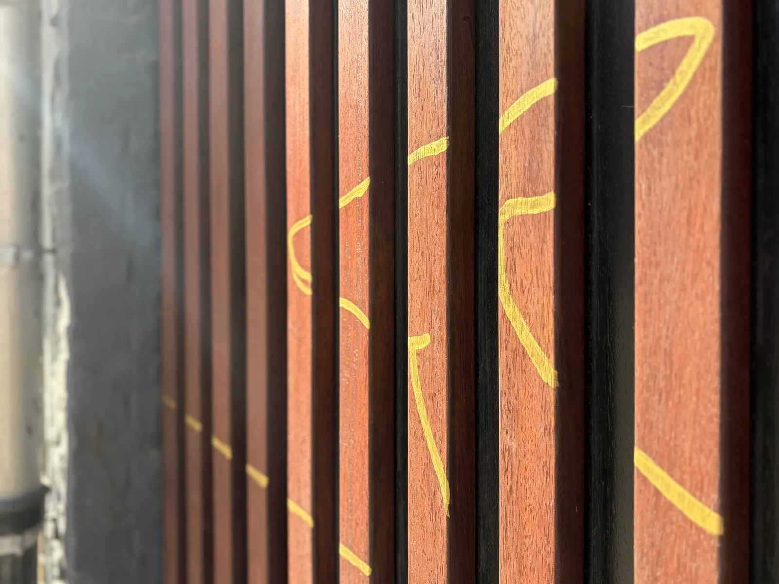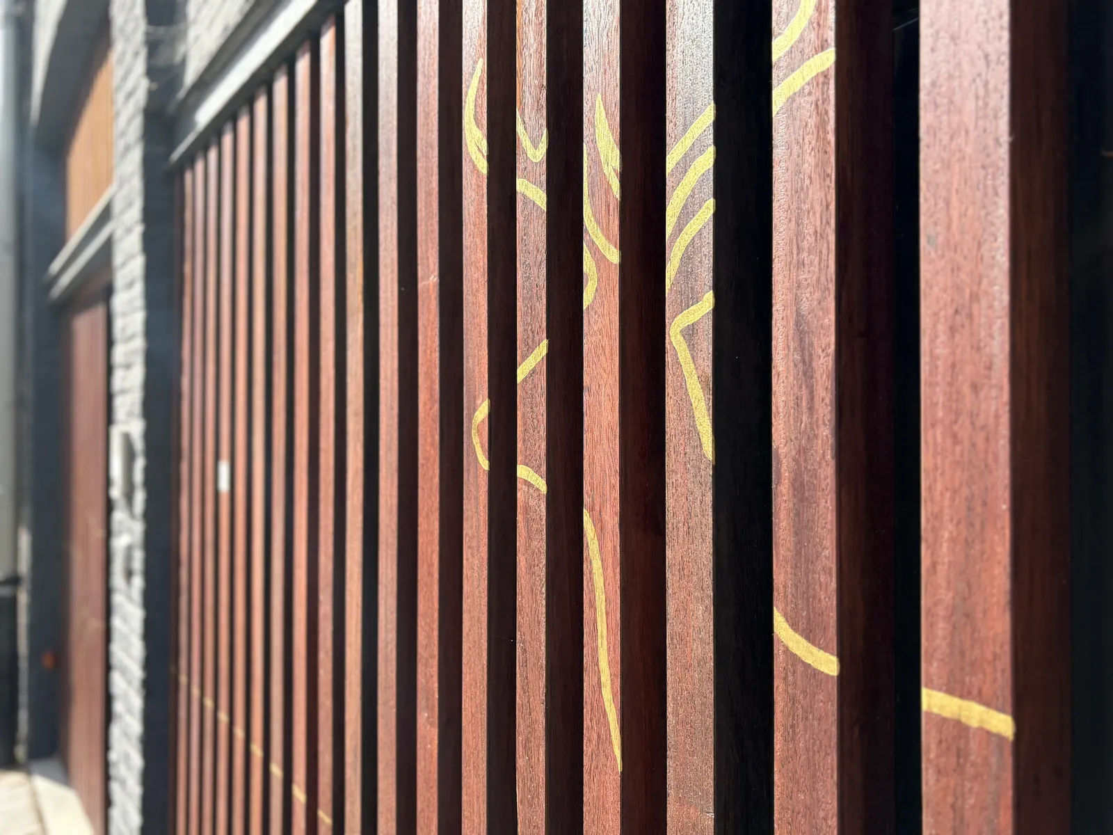 Schilderwerk met herten, in goudverf op de poorten van de voormalige smidse aan de Hertstraat 22. Vandaag is in het gebouw de co-working space ‘Werkhert’ gevestigd.