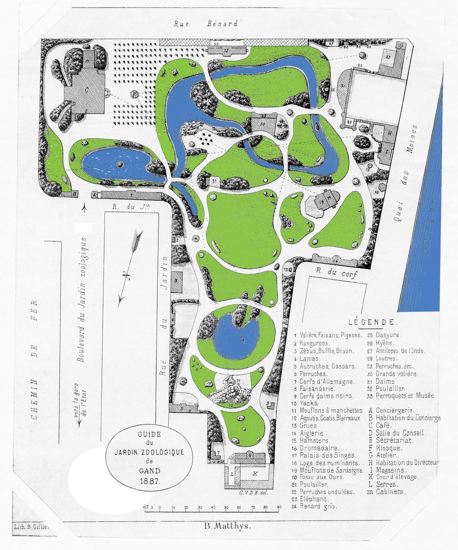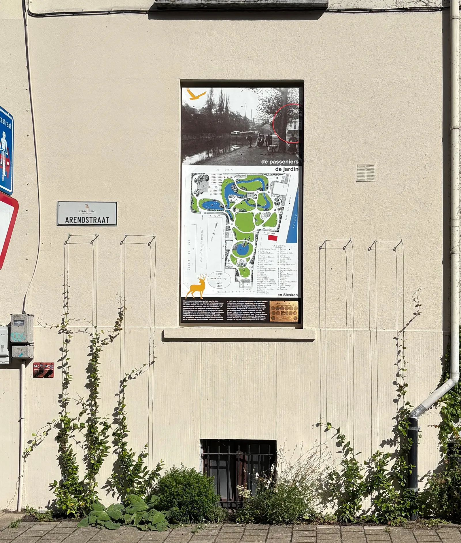 Er is ook een oud (nu ingekleurd) plan van de dierentuin uit 1887, met legende, en een publiciteispaneel van de bekende gisthandel Hillaert opgenomen, die ooit in het huis gevestigd was.