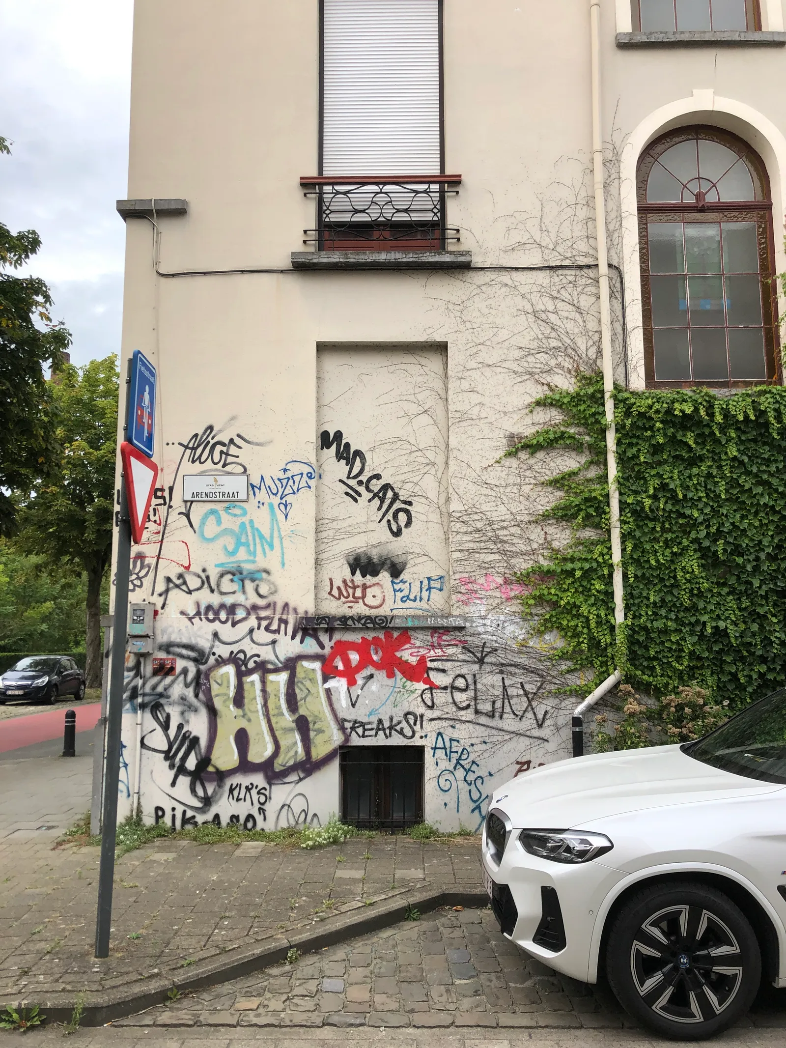 De laatste decennia was die gevel aan de Arendstraat vaak het mikpunt van wild ‘getag’. Het leek wel een wedstrijd om zo opvallend en hoog mogelijk het huis te besmeuren met deze meest basale (en in dit geval ook banale en illegale) vorm van graffiti.