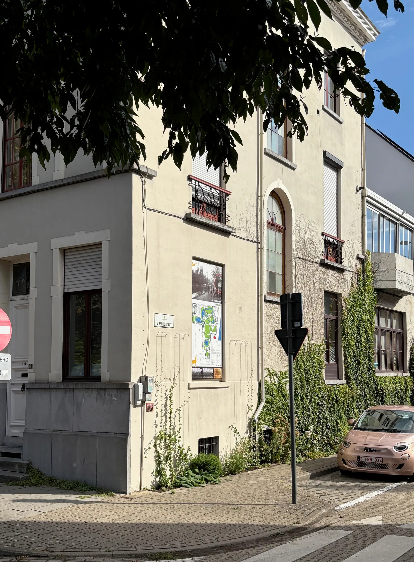 In de gevel aan de Arendstraat - die vroeger uitkeek op en over de muren van de in 1851 aangelegde ‘Jardin Zoölogique’ – zitten 2 opvallende glasramen, die vandaag nog altijd licht en kleur brengen in de traphal van het huis.
