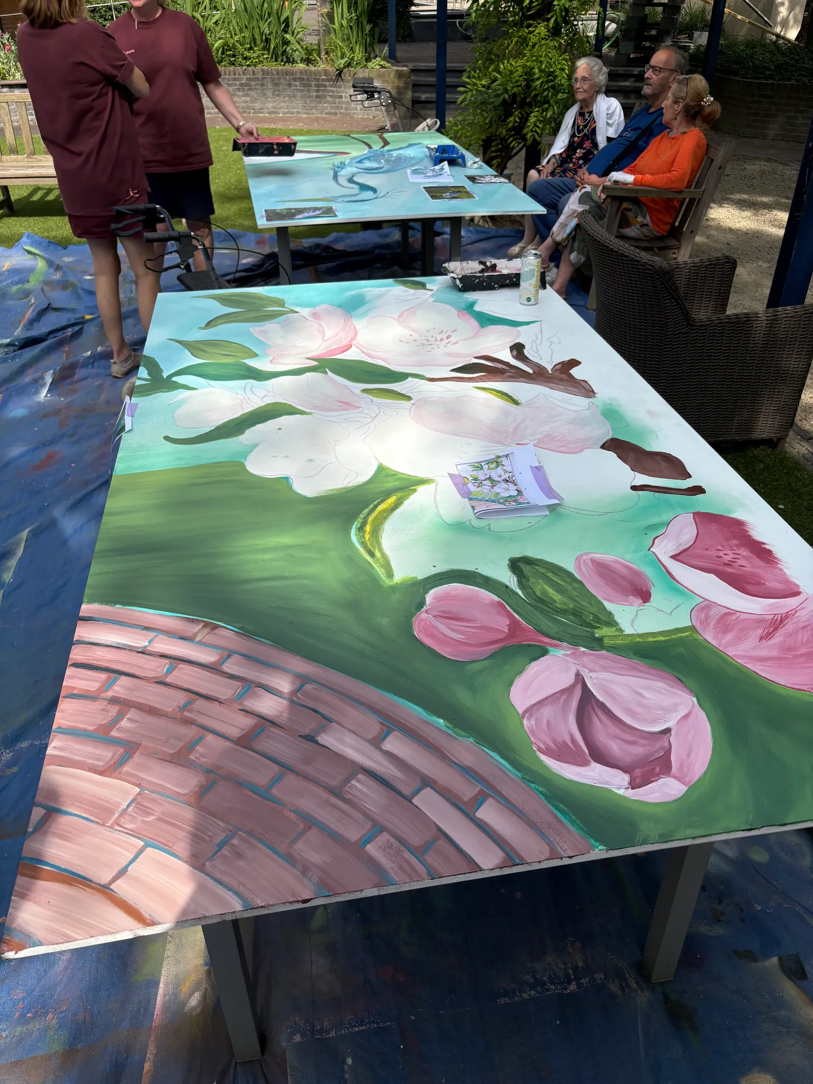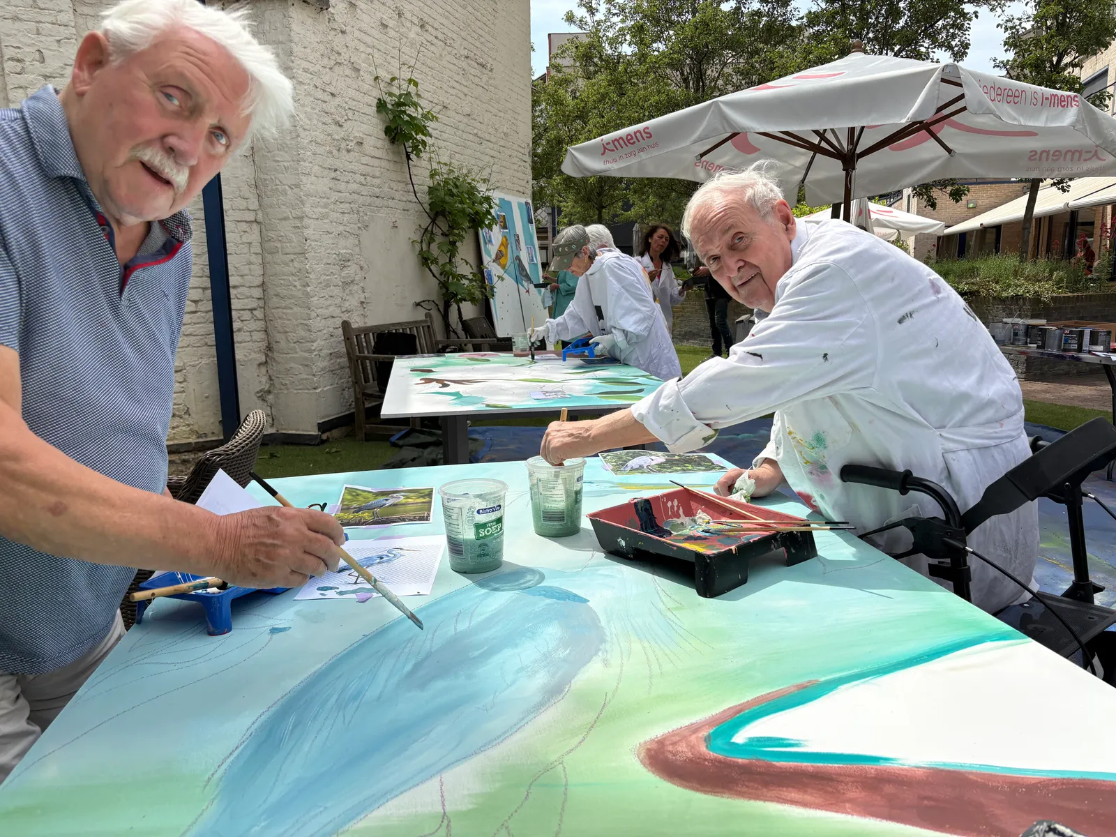 Deze twee panelen zijn het resultaat van een workshop schilderen op een mooie dag in mei, met bewoners en personeel van het Senior City Woonzorgcentrum.