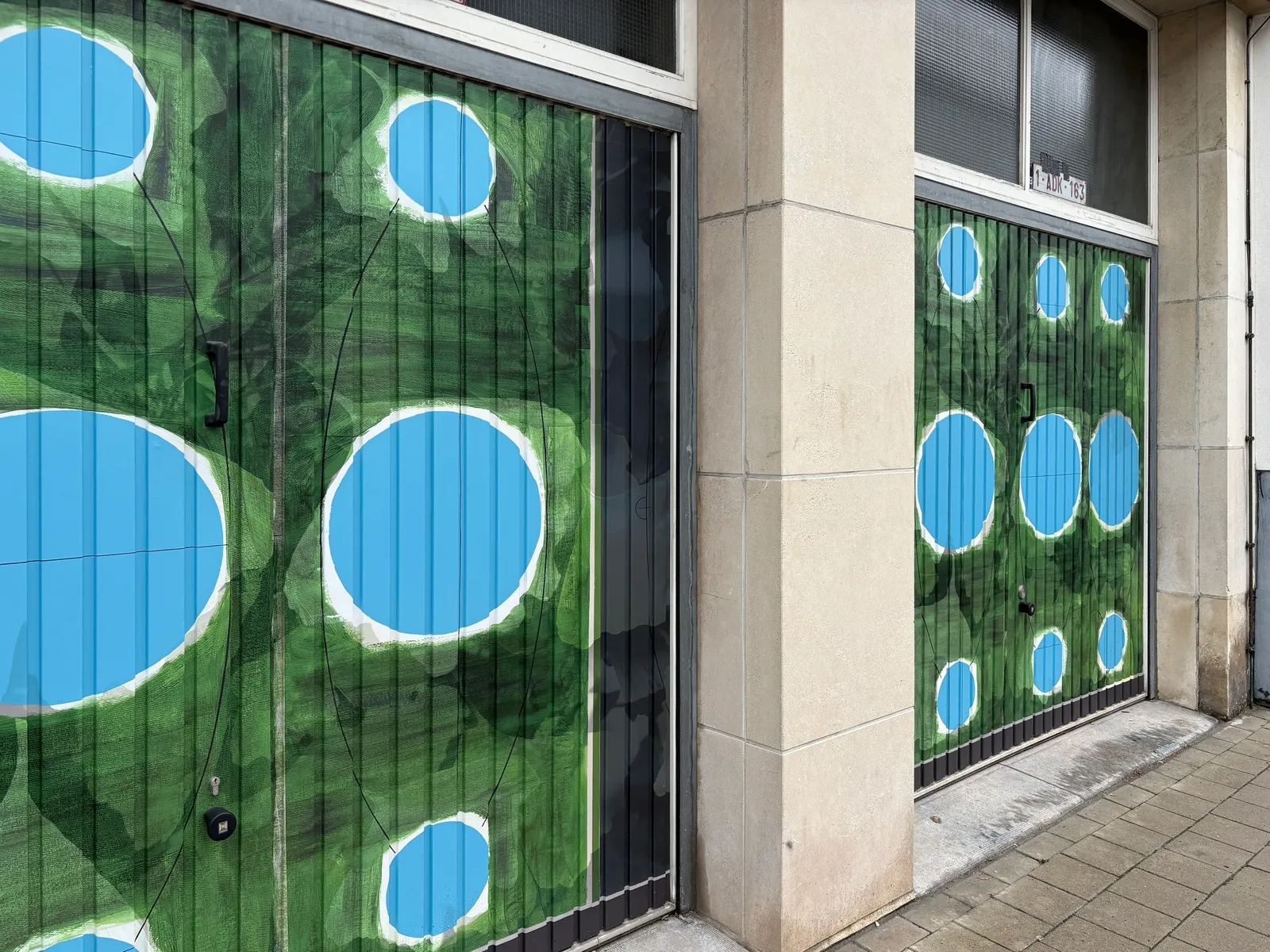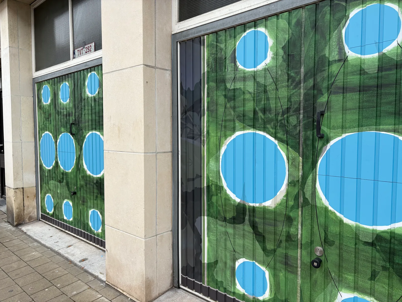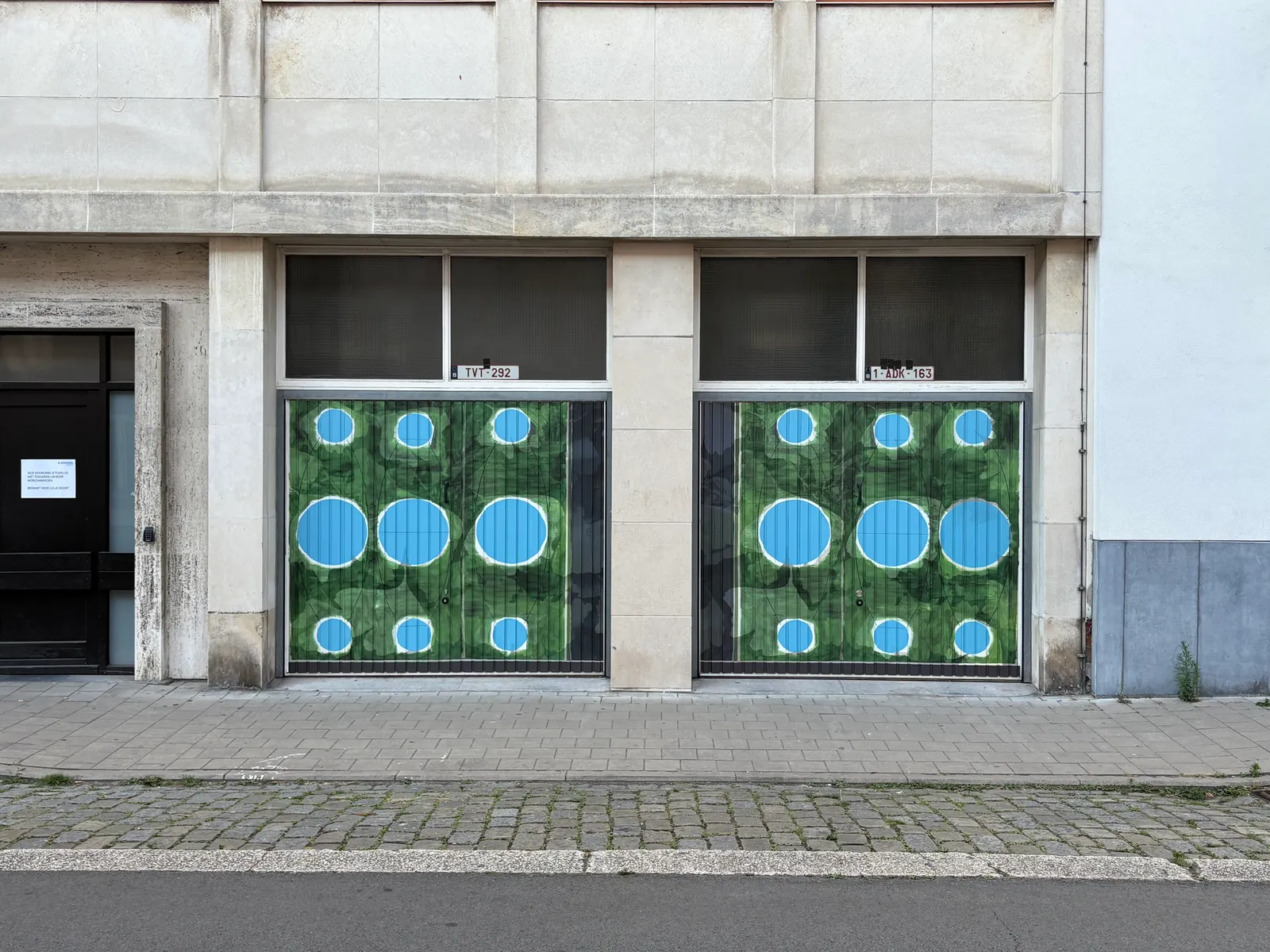 In de groene ondergrond van het gelaagde kunstwerk (aangebracht op de twee kantelpoorten van het gebouw) zijn de unieke bladeren van de Gingkgo boom vormgegeven. De blauwe cirkels daarboven, met rechte lijnen en ovalen verwijzen naar cellen, de natuur en de mens. Dit verbeeldt dan weer dat alles voortdurend met elkaar in beweging en in verbinding is.