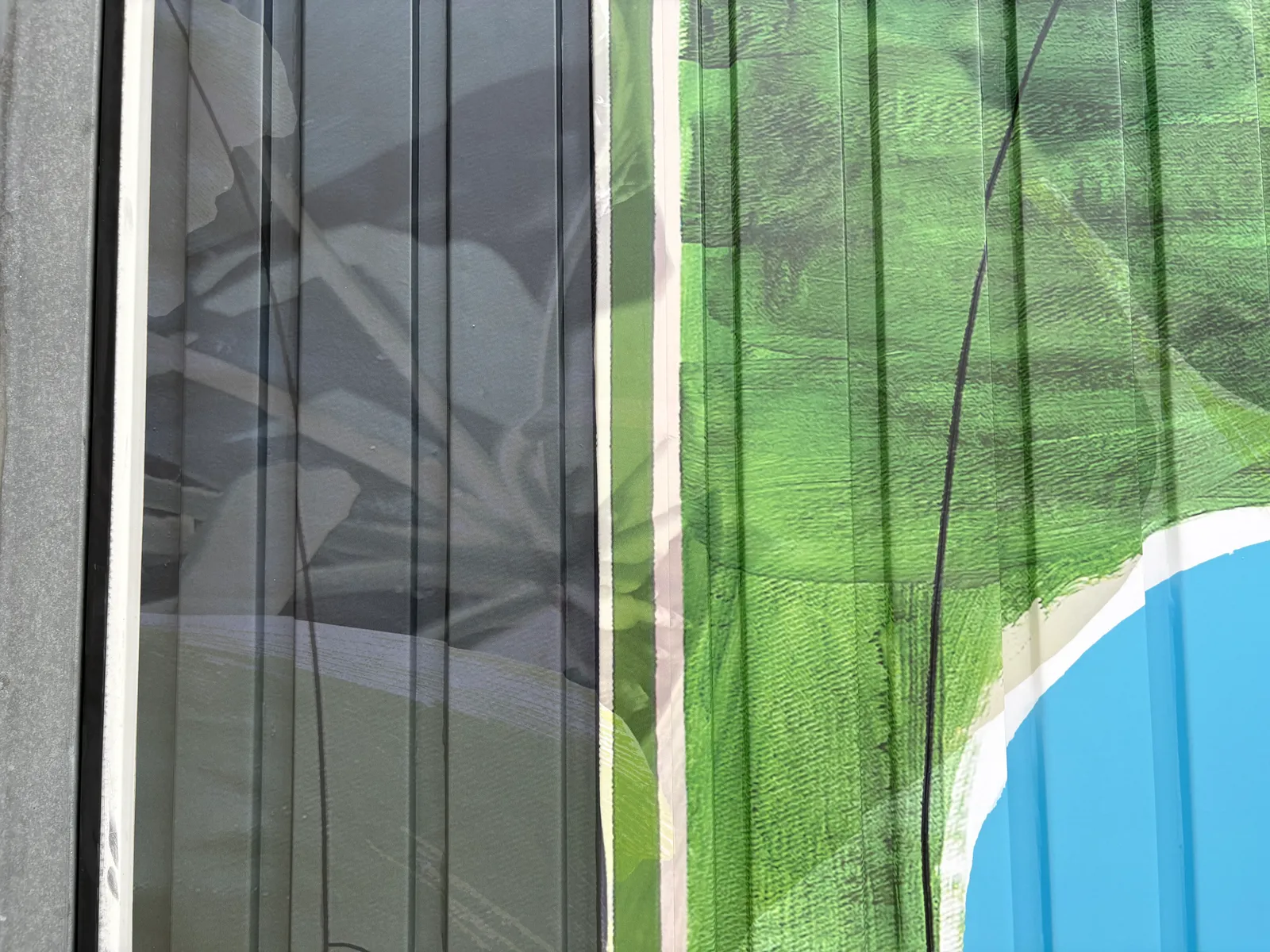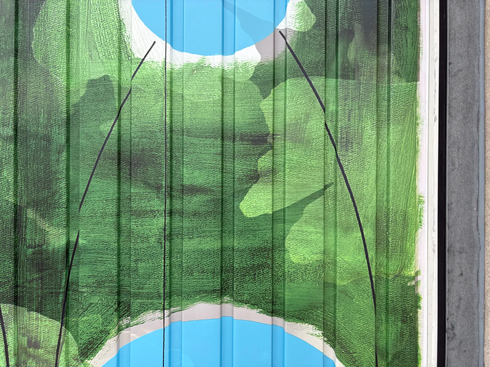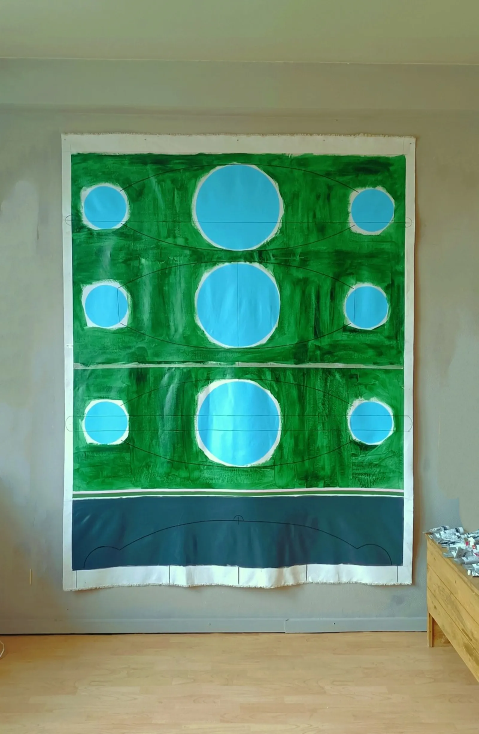 In de groene ondergrond van het gelaagde kunstwerk (aangebracht op de twee kantelpoorten van het gebouw) zijn de unieke bladeren van de Gingkgo boom vormgegeven. De blauwe cirkels daarboven, met rechte lijnen en ovalen verwijzen naar cellen, de natuur en de mens. Dit verbeeldt dan weer dat alles voortdurend met elkaar in beweging en in verbinding is.