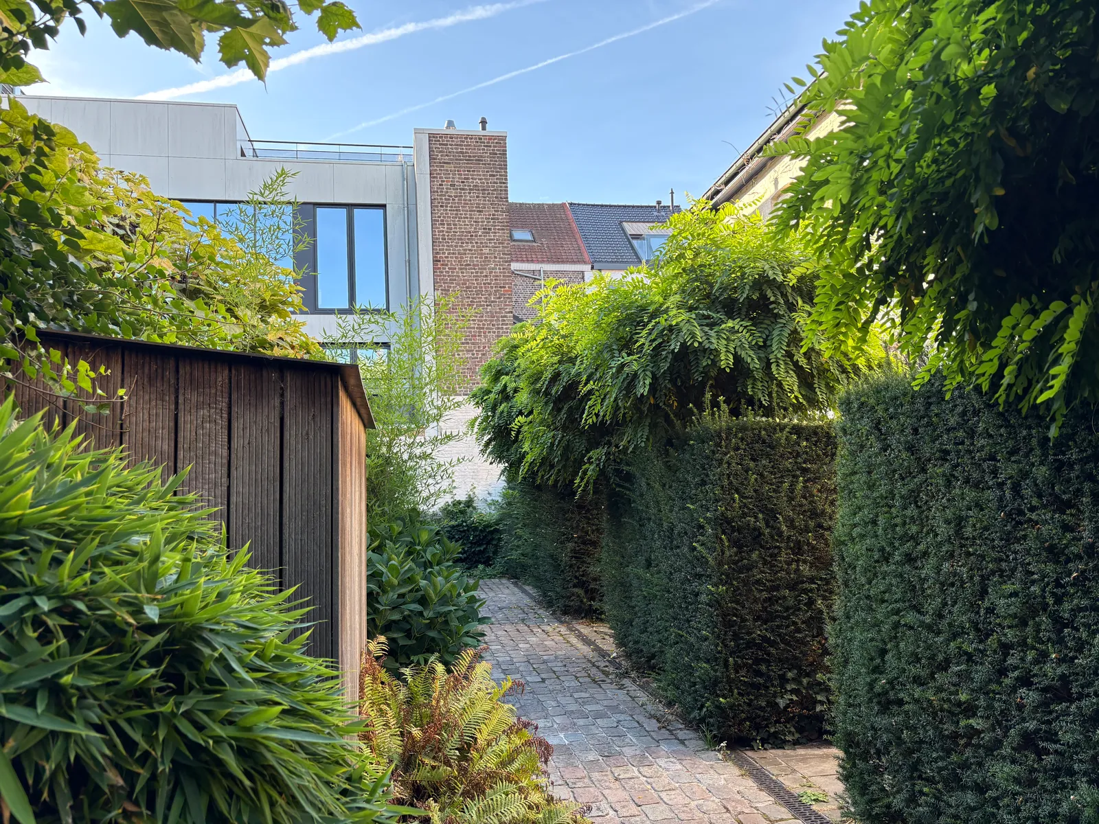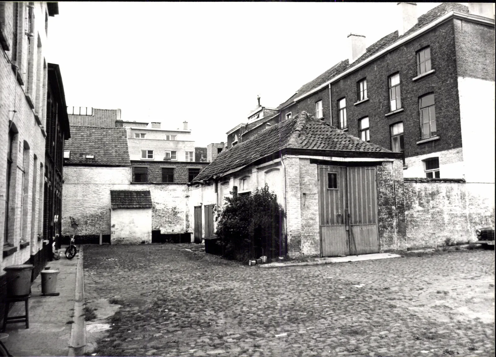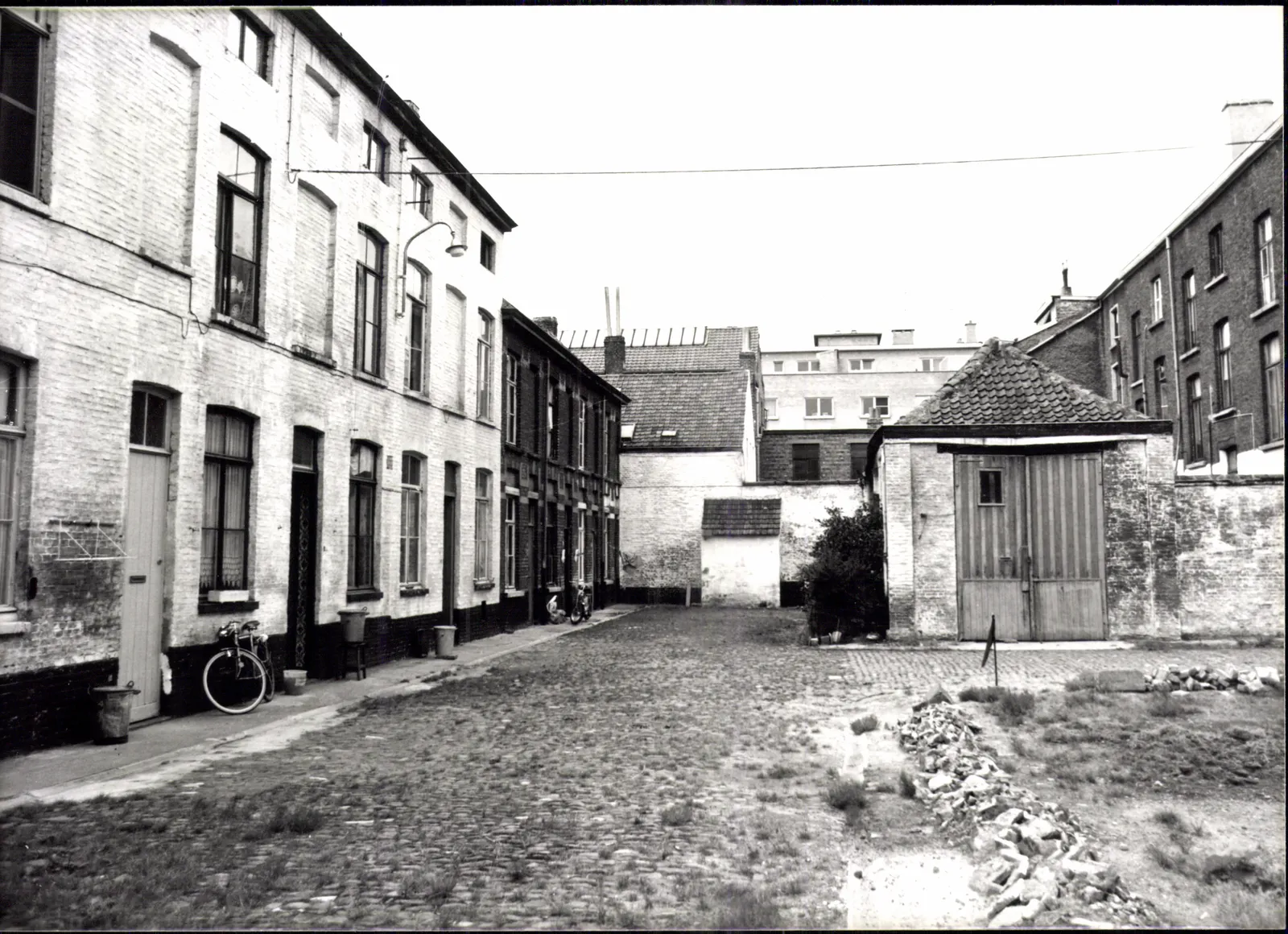 Achteraan, bij de taxushaag zie je duidelijk de T-vorm van het steegbeluik. Opmerkelijk is dat nagenoeg alle woningen achteraan zijn ontstaan uit de verbouwing van oudere industriële constructies die daar gelegen waren. In de loop der tijden volgden nog transformaties. Zo werden (links) de huisjes 1 tot 4 gesloopt, en (rechts) drie huisjes samengevoegd tot één woning. In de cité was het lange tijd leven in erbarmelijke omstandigheden, waarbij bewoners, naast toiletten, één gemeenschappelijke waterkraan deelden. Het duurde zelfs tot 1993 eer elk huisje water en sanitair binnen had.