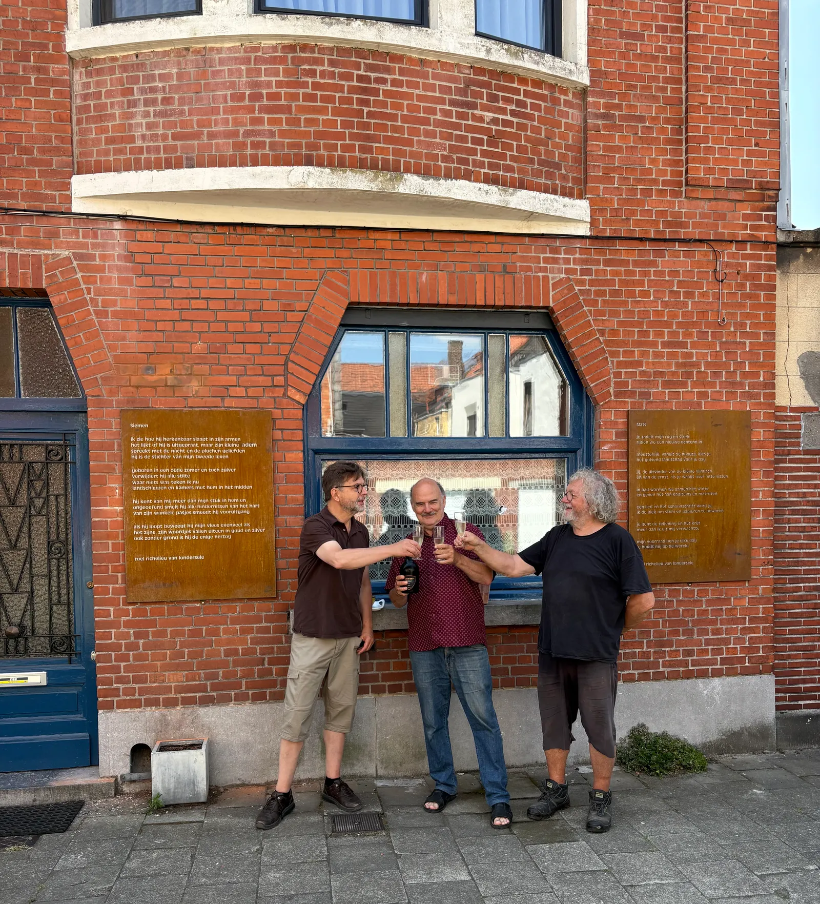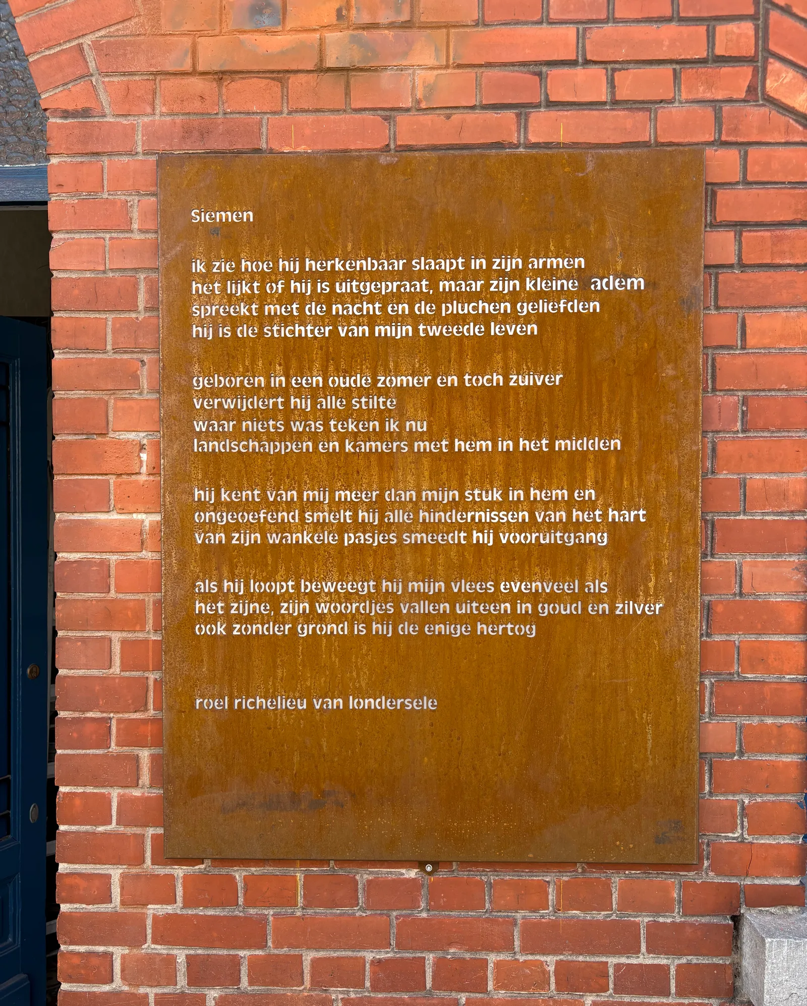De gedichten Siemen en Mats hangen aan de gevel van Buffelstraat 2 omdat mijn twee zonen in dit huis geboren zijn, een keuze van hun moeder.